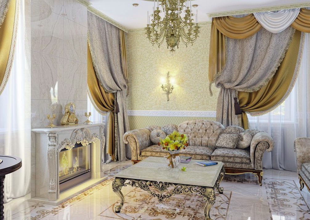 Декор играет важную роль: зеркала в тяжелых рамах, канделябры, настенные панно, классические скульптуры усиливают эффект парадности.